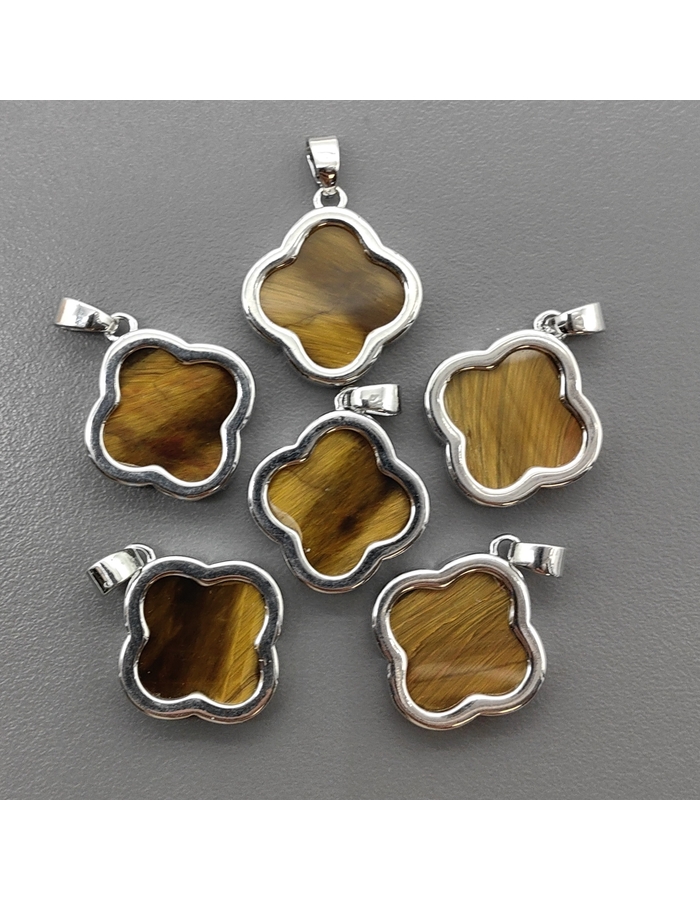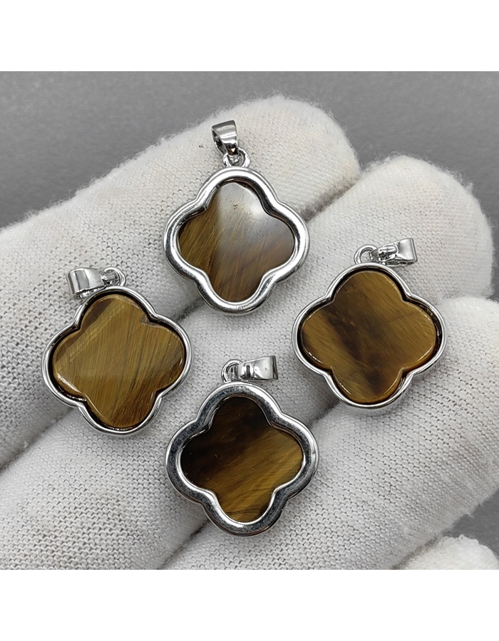 Подвеска Клевер, тигровый глаз, 18*16 мм, родий