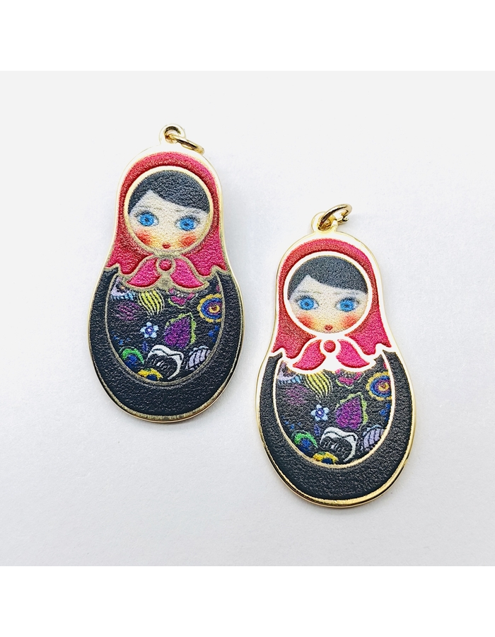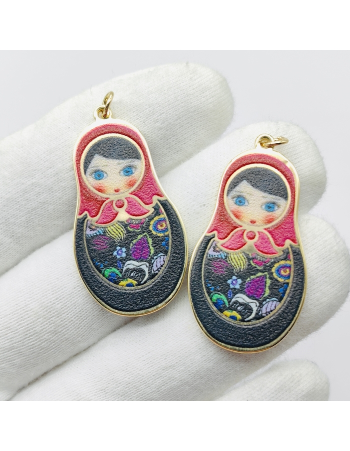 Подвеска Матрешка с черной микс эмалью, 20*35 мм, позолота