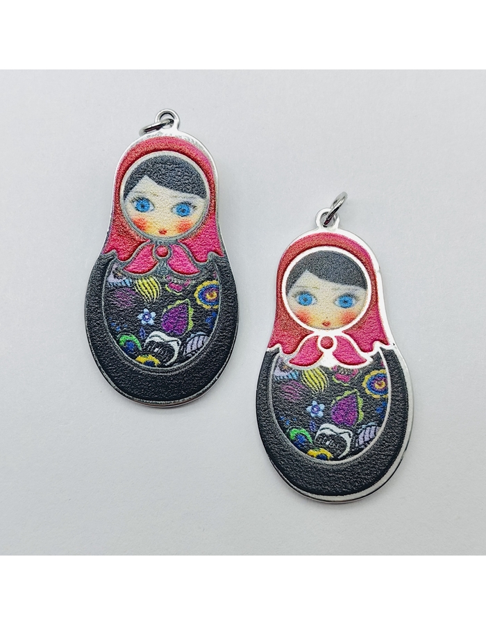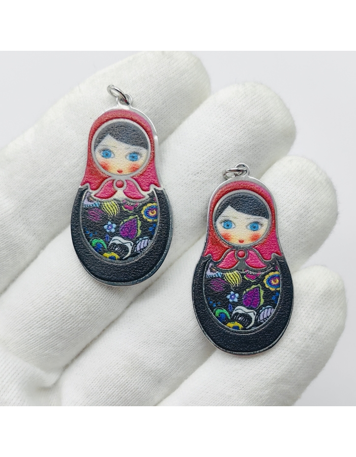 Подвеска Матрешка с черной микс эмалью, 20*35 мм, родий